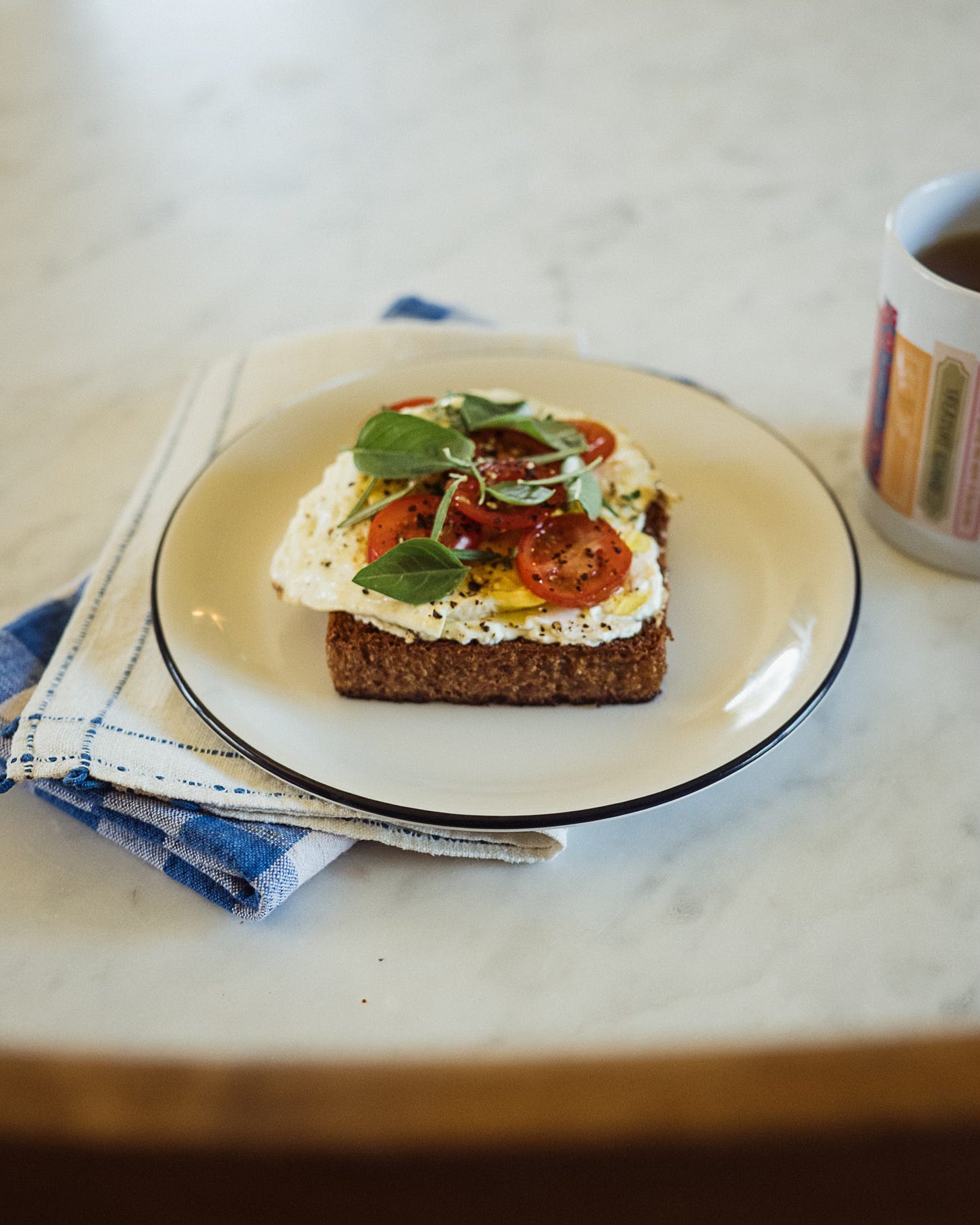 Add the egg on top, along with the fresh herbs and garden tomato.